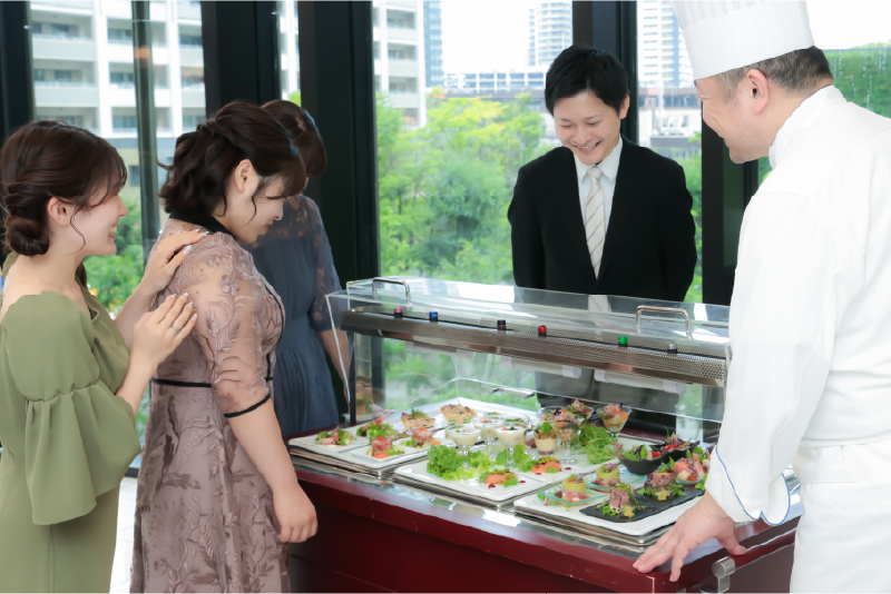 アヴァンセリアン東京では『フードコミュニケーション』をテーマに、前菜のワゴンサービスやデザートブッフェなど、お料理を囲んで自然に会話が弾む工夫をご用意しております。余興や特別な演出がなくても、心配なく楽しいひとときをお過ごしいただけます。